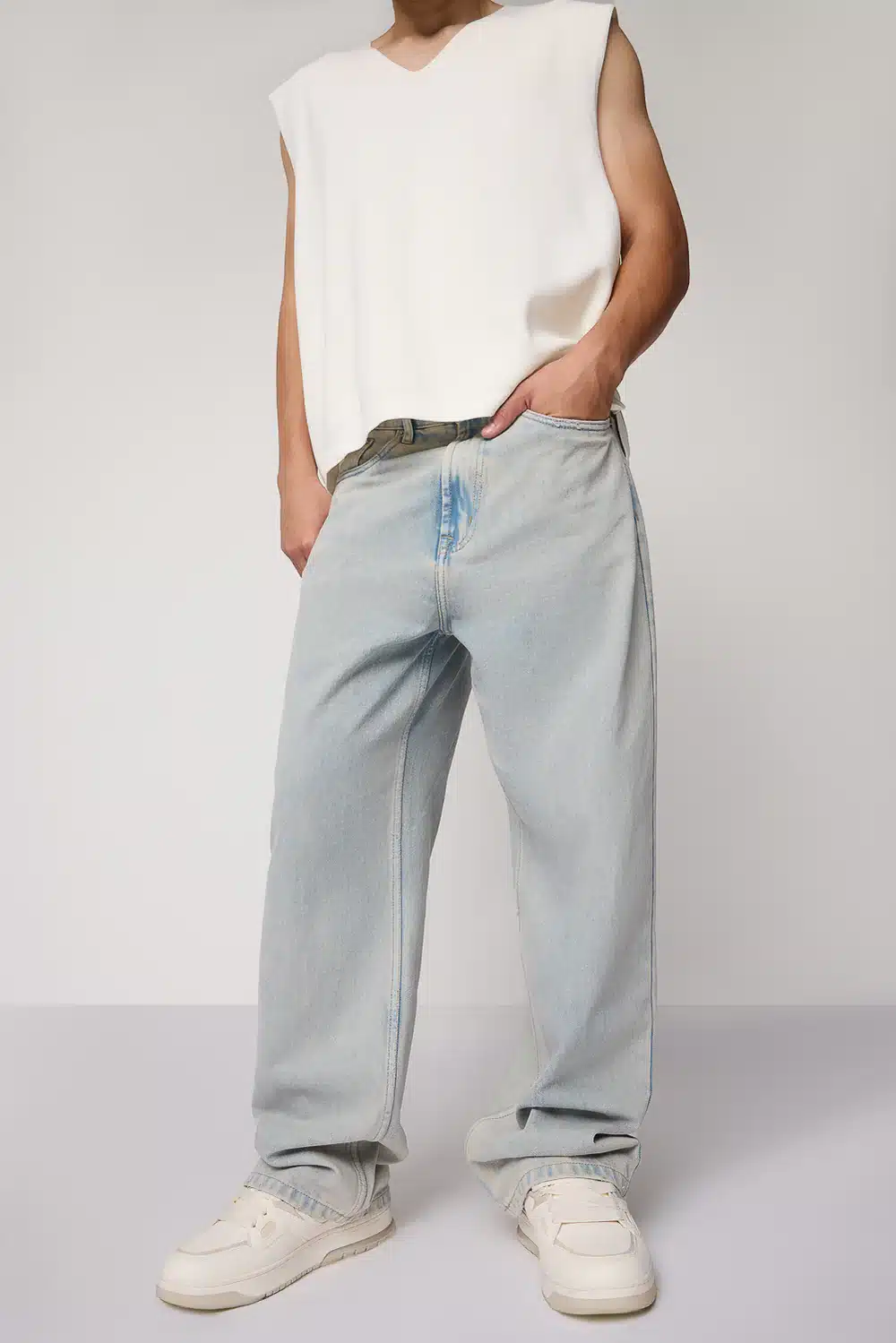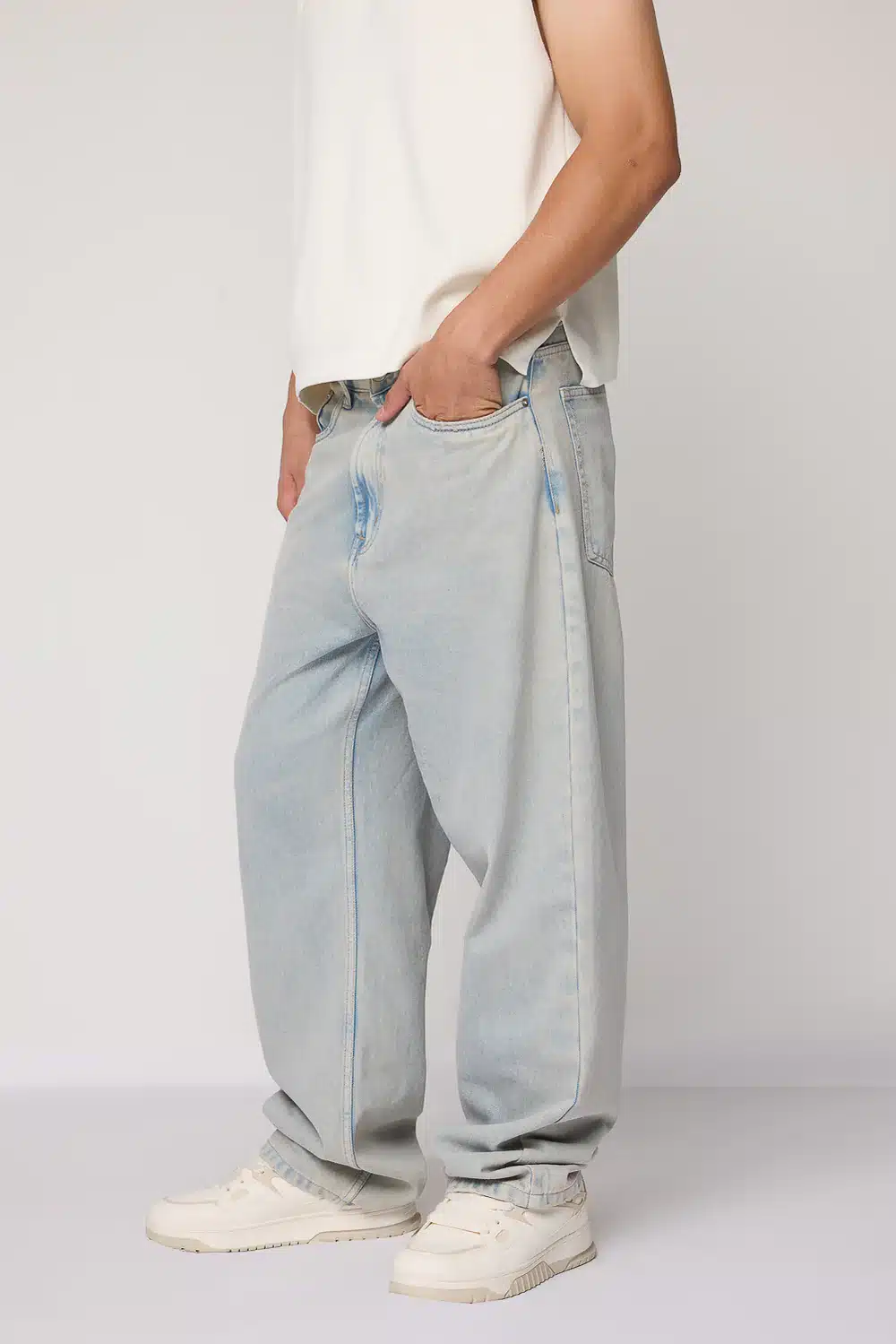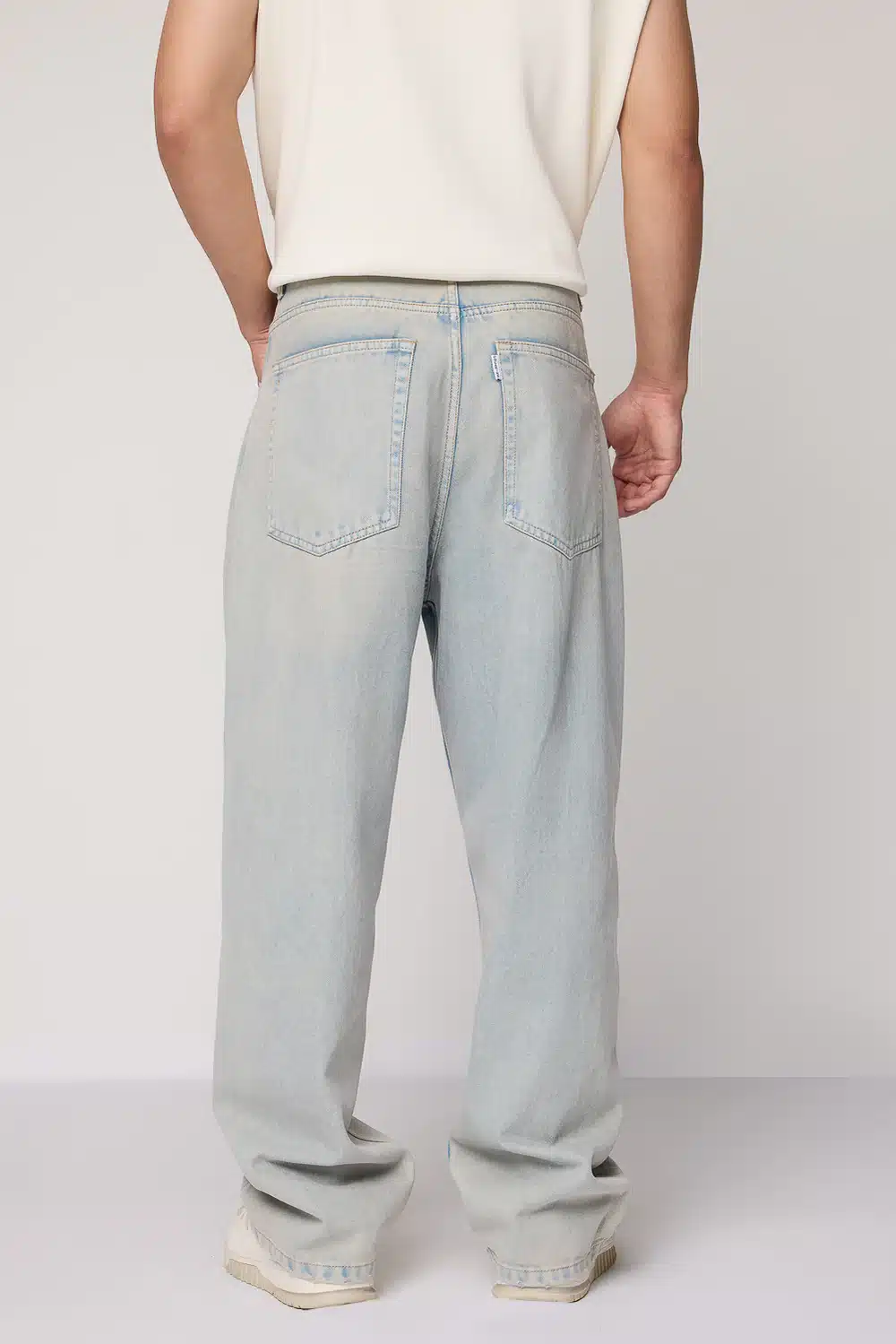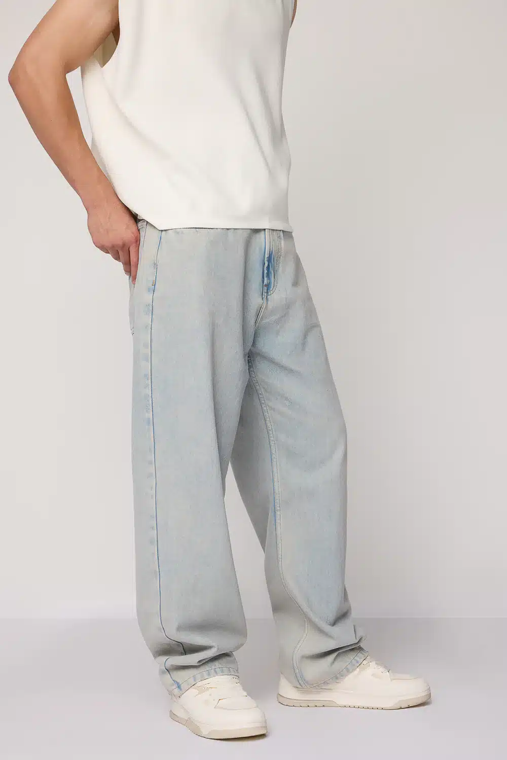 Blue Light Washed Relaxed Baggy Jeans for Men. Designed for those who appreciate roomier silhouettes, these jeans offer a relaxed fit with a generous cut through the thighs and legs, making them the ideal pick for casual days, skate-inspired outfits, or simply lounging in style. The light blue wash adds a fresh and vintage touch, creating a versatile base that works with everything from neutral tees to bold graphic tops.