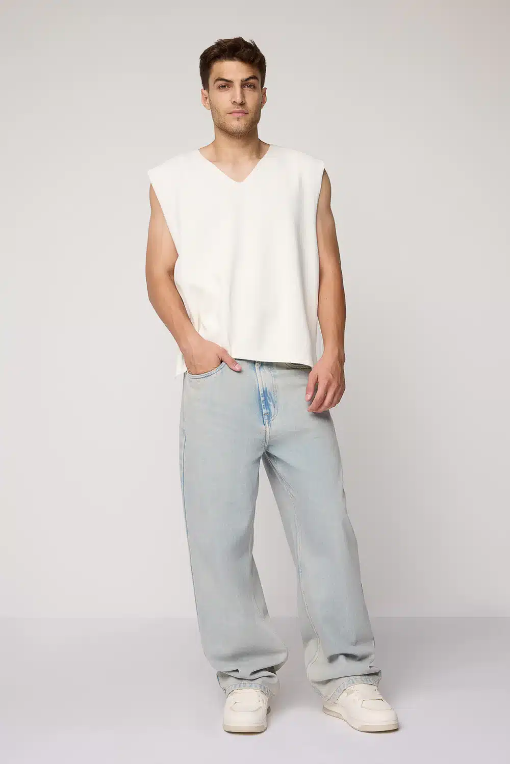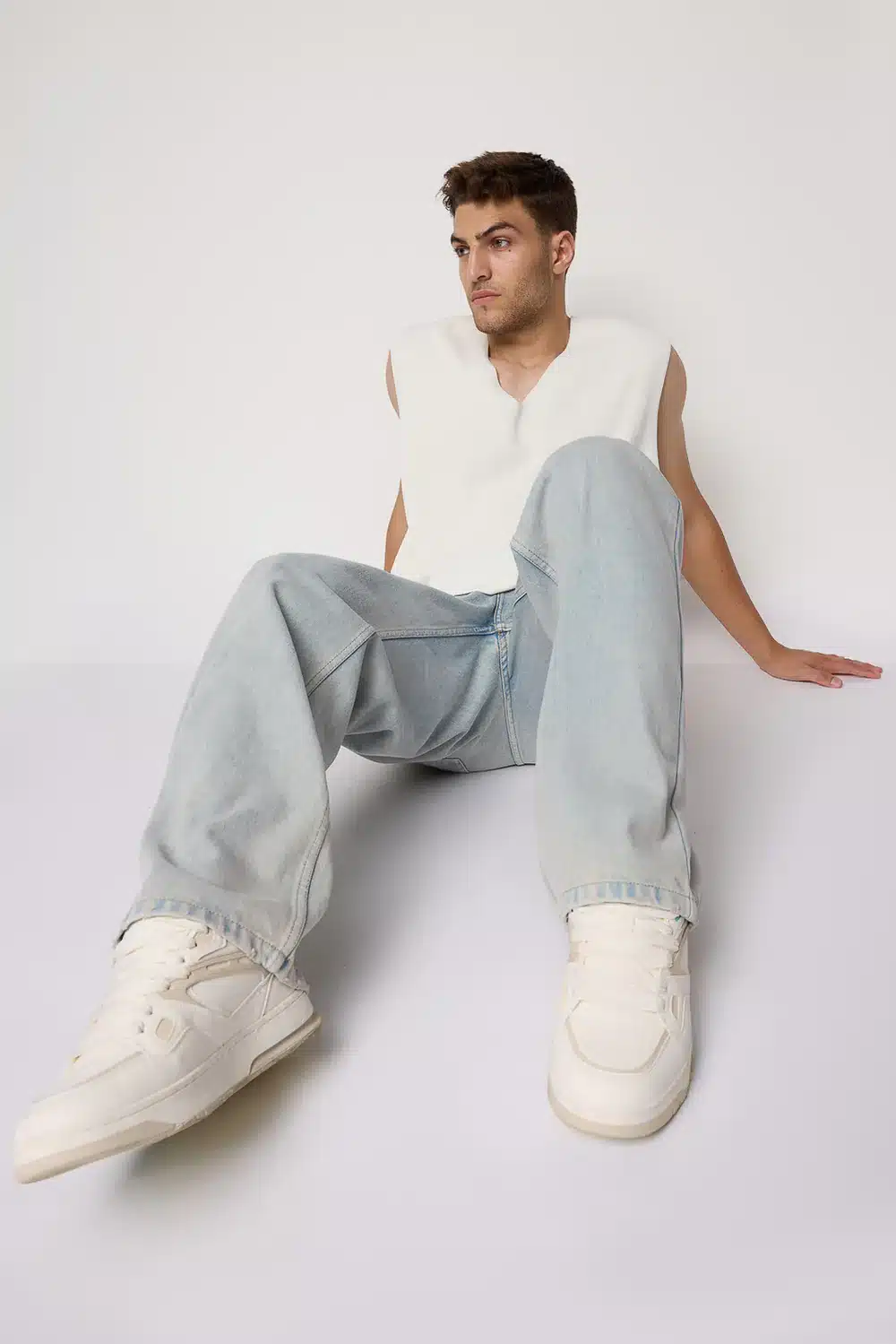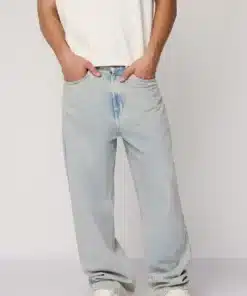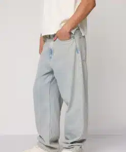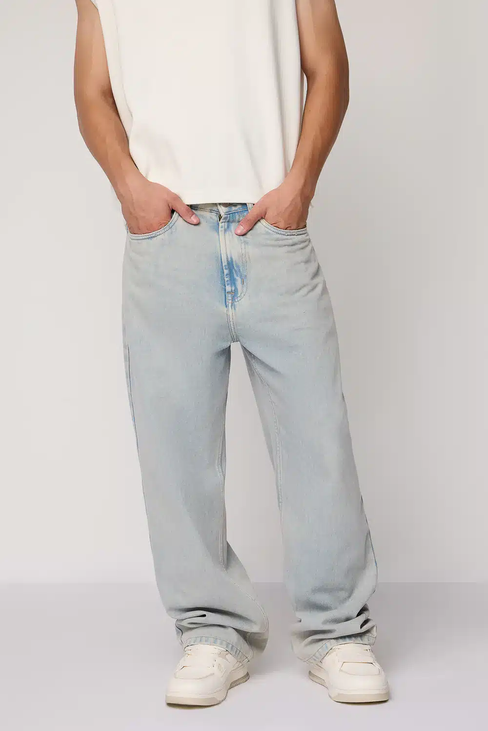 Blue Light Washed Relaxed Baggy Jeans for Men. Designed for those who appreciate roomier silhouettes, these jeans offer a relaxed fit with a generous cut through the thighs and legs, making them the ideal pick for casual days, skate-inspired outfits, or simply lounging in style. The light blue wash adds a fresh and vintage touch, creating a versatile base that works with everything from neutral tees to bold graphic tops.