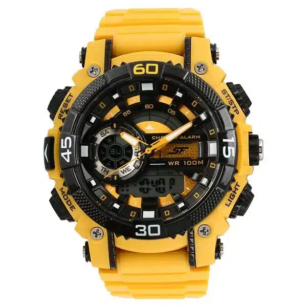 Men’s Analog-Digital Watch with Black Dial and Yellow Strap blends rugged styling with advanced functionality. Built for men who thrive on versatility, this watch combines the precision of digital technology with the classic appeal of analog timekeeping. Its bold black dial forms a striking contrast with the vibrant yellow strap, making it an instant standout on the wrist.