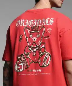 Men’s Casual Oversized T-Shirt in Red with Graphic. This eye-catching piece combines a rich, vibrant red tone with a sharp graphic print that captures attention without saying a word. Whether you’re out for a laid-back day or hitting a weekend hangout, this tee is built to stand out while keeping things effortlessly cool.